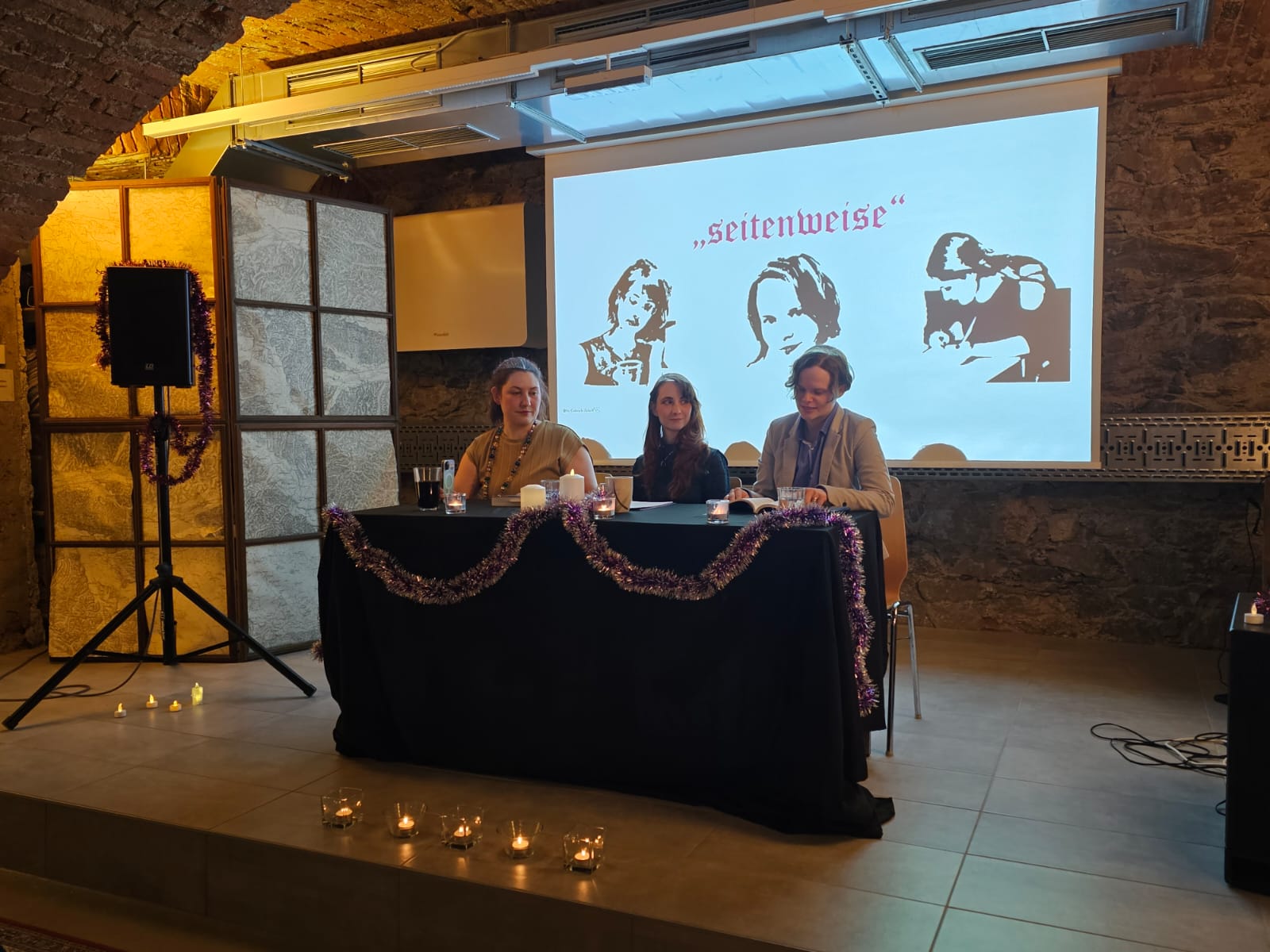 Das Literaturkollektiv „seitenweise“ verwandelte Ende November das Schubertnest in der Elisabethstraße in einen stimmungsvollen Ort voller traumhaft vorweihnachtlicher Texte. Bereits seit 2016 sind die drei Schreibenden zusammen auf Bühnen und Messen unterwegs und ergänzen sich dabei abwechslungsreich. Während Ela Bloom vor allem im RomCom-Bereich schreibt, widmet sich Tonip the writer aus dem Leben gegriffenen Kurzgeschichten und Clara C. Fey entführt das Publikum in fantastische Welten. Der Titel des Abends „Lesung im Kerzenschein“ war Programm: im stimmungsvollen Ambiente, unter den Bögen des atmosphärischen Gewölbekellers, lauschten die Besucher:innen zwischen flackernden Lichtern den romantischen Texten, mit denen die drei Writer die Adventzeit einläuteten. Umrahmt wurde der Abend von anregenden Gesprächen mit den Autor:innen und einem weihnachtlichen Buffet. Und natürlich konnte man die Werke auch alle vor Ort erwerben und gleich persönlich signieren und widmen lassen. Die „Lesung im Kerzenschein“ fand damit bereits das zweite Jahr in Folge statt und begeisterte ein volles Auditorium.