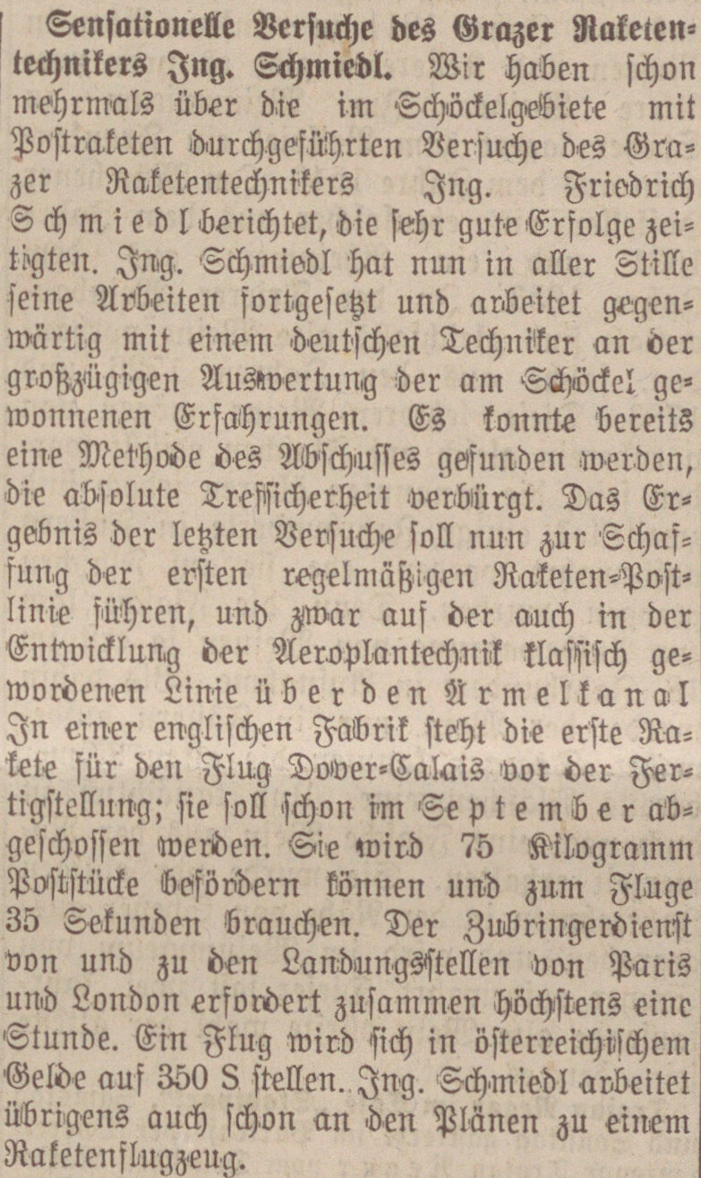 Es ist die Geschichte von Friedrich Schmiedl, dem „Vater der Raketenpost“, der 30.000 Briefe durch den Himmel schickte und sein Lebenswerk lieber vernichtete, als es dem Militär zu überlassen.